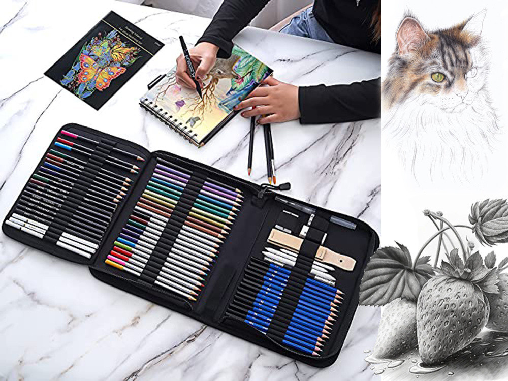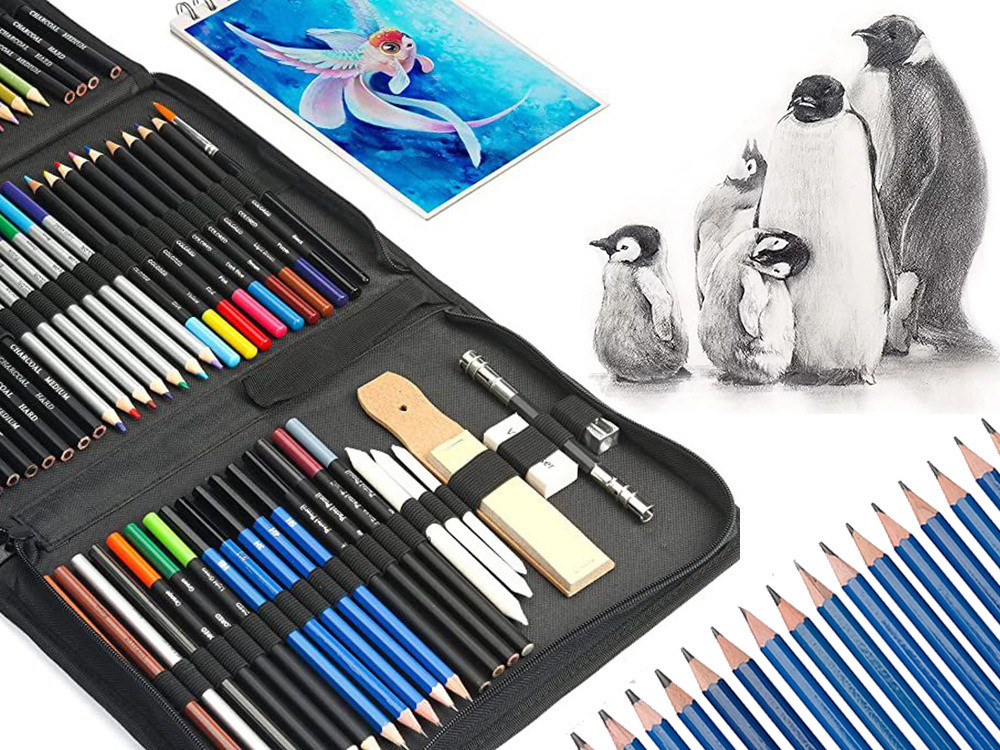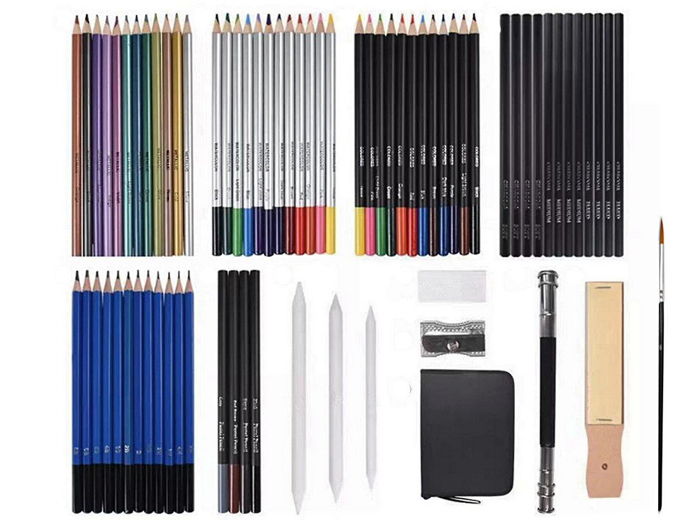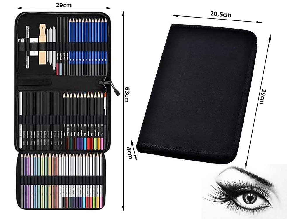 Professzionális 74 részes rajzkészlet – ceruzák, szén, pasztell, színes ceruzák és tartozékok praktikus tokban